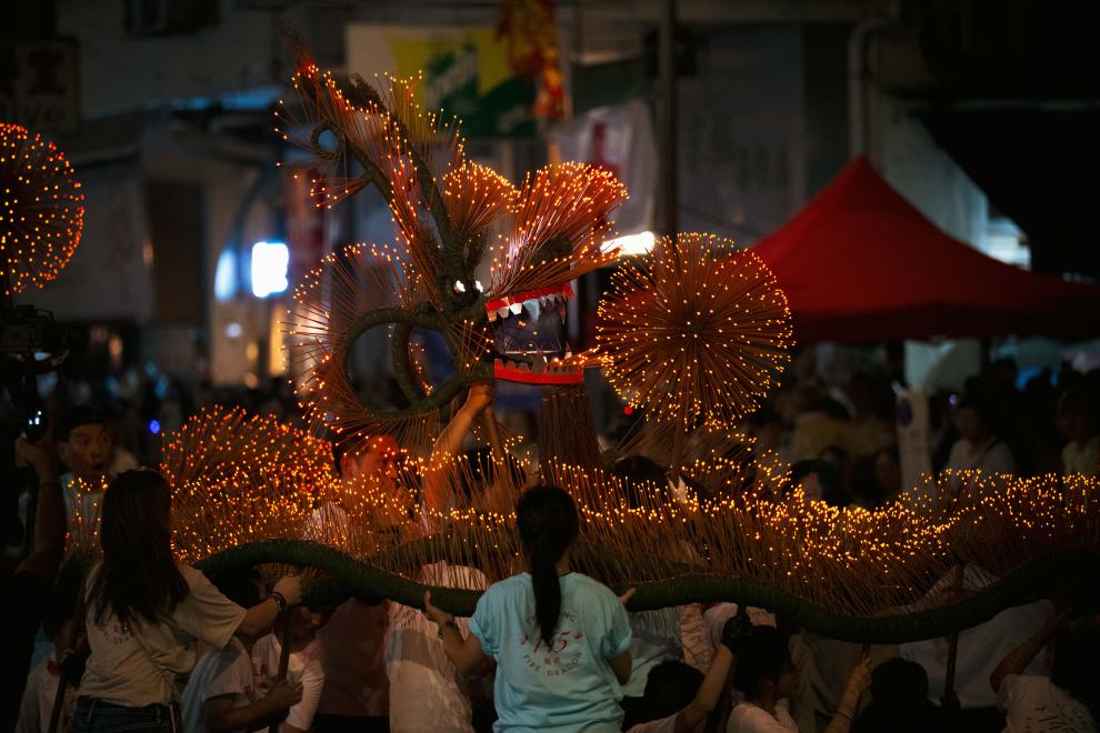 舞火龙的队伍从大坑走到维多利亚公园,蜿蜒起伏的火龙在锣鼓声中欢腾起舞,热闹非凡,平日宁静的街区变得火光闪烁。一条六十多米长的火龙承载的是香江儿女对美好生活的期待和向往,约百名青少年组成的队伍舞动着约1万颗LED灯点亮的“小火龙”亮相,更是对传统文化的敬意与延续。