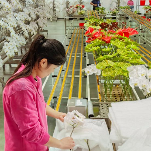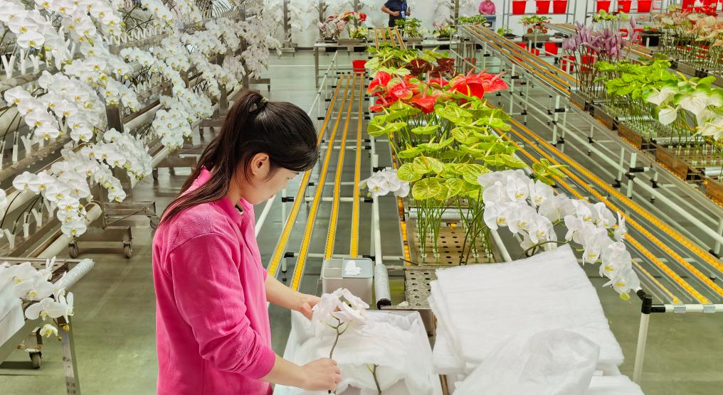位于临沂市兰陵县的山东新格林智慧农业产业园内,附近村庄的村民正在打包鲜切蝴蝶兰。新华社记者 叶婧 摄