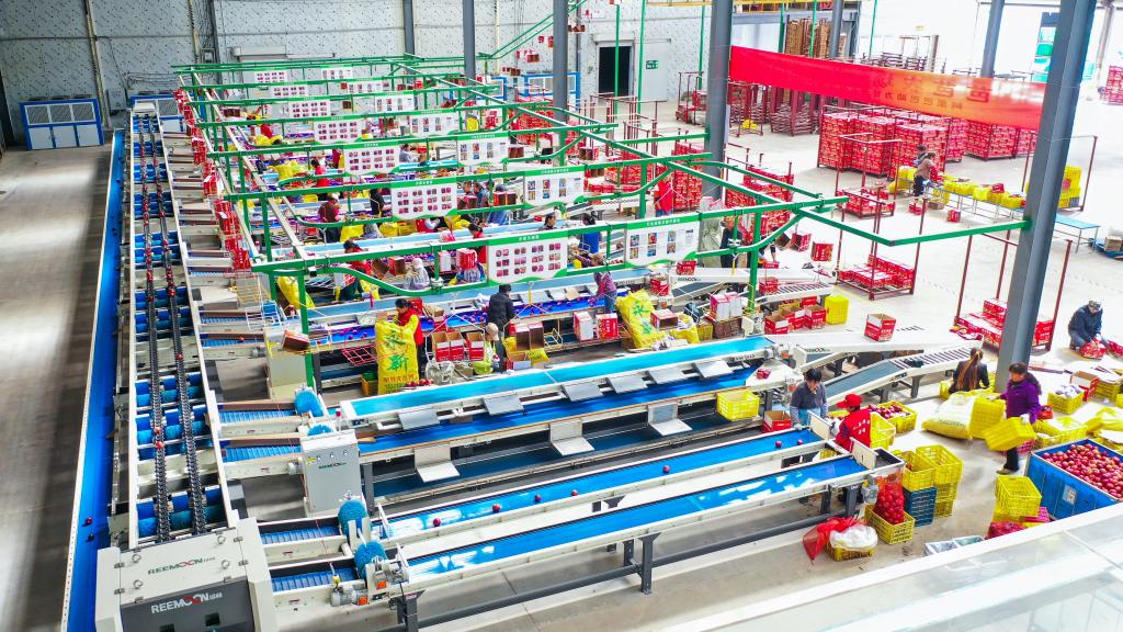 在礼县苹果产业发展集团有限责任公司拍摄的数字化智能苹果分选车间景象(无人机照片)。新华社记者 郎兵兵 摄