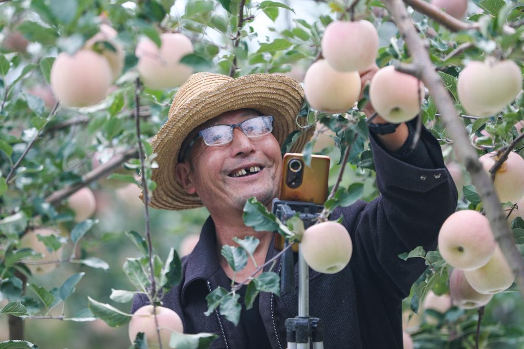 在礼县永兴镇龙槐村,61岁的果农张加成在自家苹果园直播带货。 新华社记者 郎兵兵 摄
