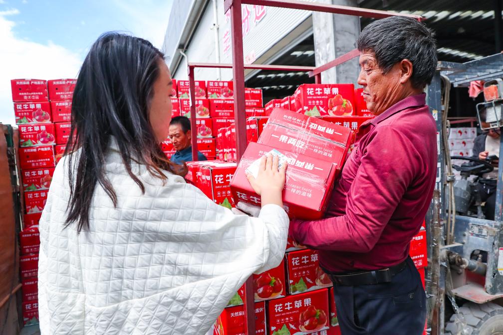 在礼县苹果产业发展集团有限责任公司,一家快递公司工作人员(左一)为即将发货的苹果贴上快递单。新华社记者 郎兵兵 摄