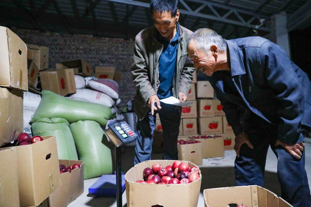在礼县永坪镇冉城村,苹果收购商冉进有为村民王满粮的苹果称重。新华社记者 郎兵兵 摄