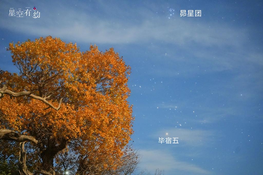 2024年10月14日在新疆哈密伊吾胡杨林拍摄的金牛座(含昴星团和毕宿五)。(王俊峰摄)