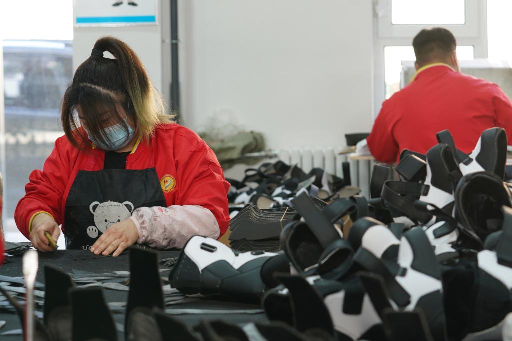 德弘冰雪运动科技有限公司工作车间里,工作人员正在生产滑雪鞋。新华社记者 司晓帅 摄