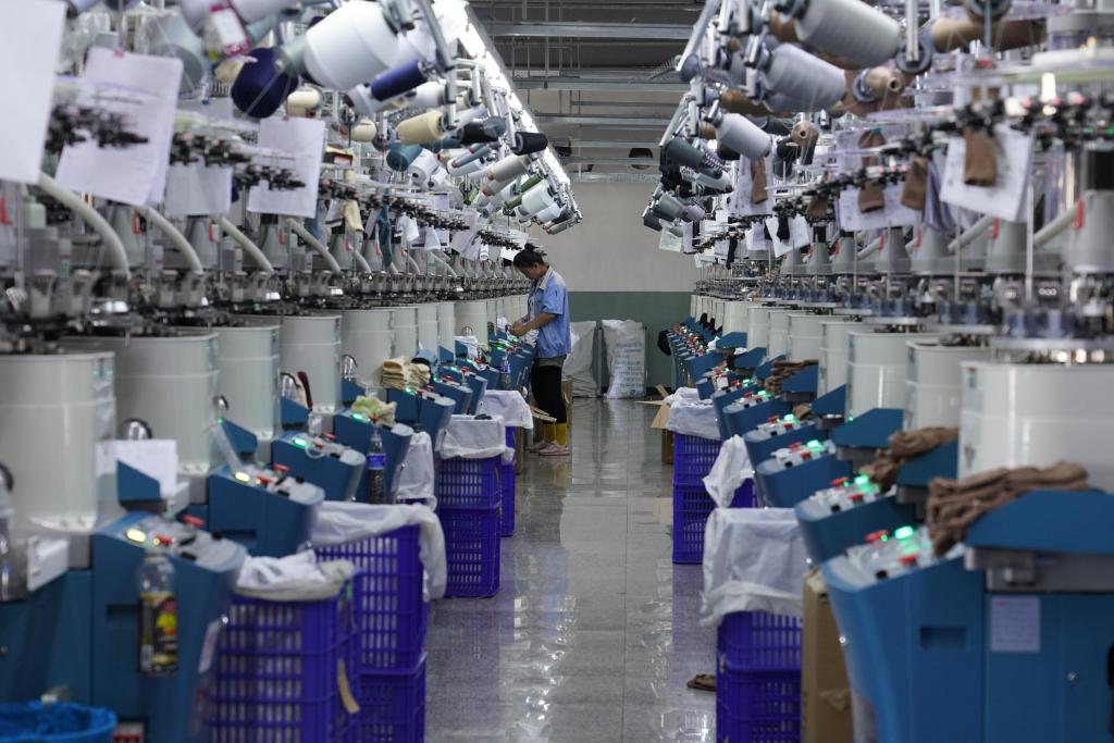 辽源北方袜业集团织袜公司的生产车间,工作人员在查看冰雪袜。新华社记者 司晓帅 摄