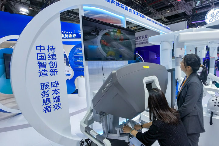 11月8日,一名参观者(左)在第七届进博会医疗器械及医药保健展区复星医药展台体验操作一款外科手术机器人。新华社记者 张铖 摄
