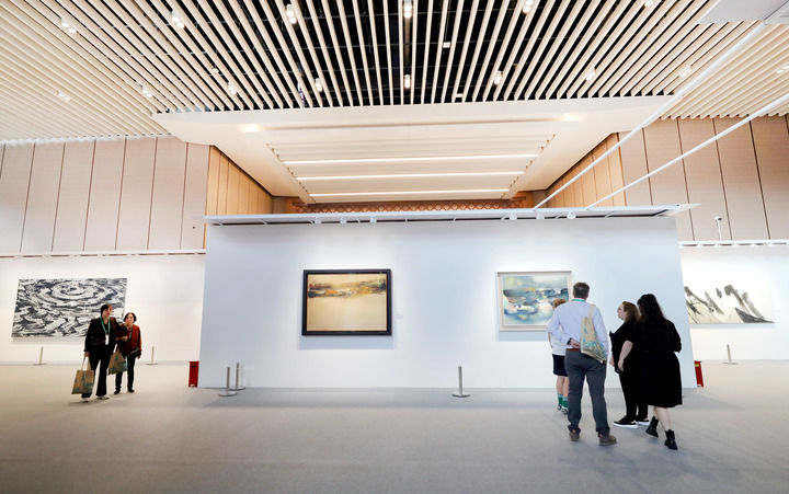 11月9日,观众在第七届进博会国际现当代艺术专区观看绘画艺术展品。新华社记者 方喆 摄