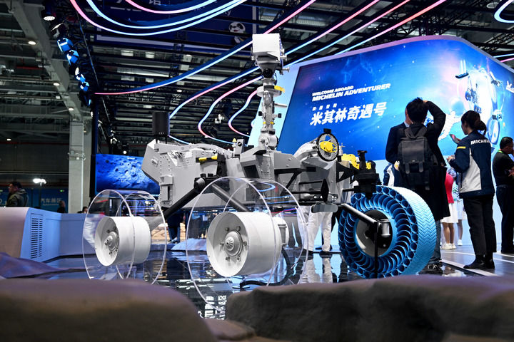 这是11月6日在第七届进博会汽车展区拍摄的在亚洲首次亮相的米其林月球探测车轮胎。新华社发(陈浩明 摄)
