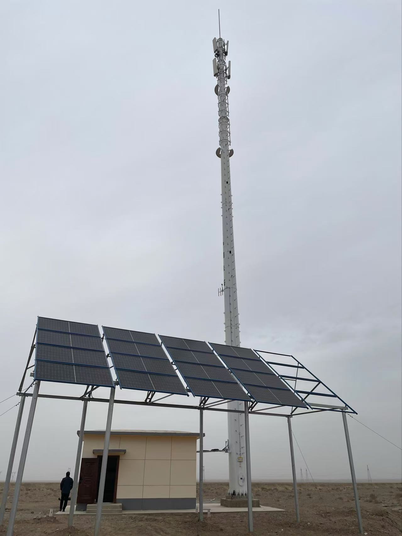 酒泉金嘉公路起点位于甘肃省酒泉市金塔县胡杨大道,终点位于甘肃嘉峪关市泥沟村。该公路是打通金塔县至嘉峪关市的唯一一条交通要道,全长43.4公里,其中金塔段全长37.7公里。该公路自建成以来,长期无网络信号,给沿途车辆带来诸多不便。酒泉铁塔主动协助工信局及三家运营商申报电信普遍服务试点项目,最终将此道路覆盖纳入2023年电信普遍服务试点项目清单,此条公路共规划建设3个站点,目前已全部建设完毕交付并开通使用。该基站塔型为单管塔+土建机房,因无法引接市电,采用太阳能供电。
