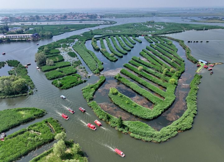 游船在河北雄安新区白洋淀内游览(2024年5月8日摄,无人机照片)。新华社记者 牟宇 摄