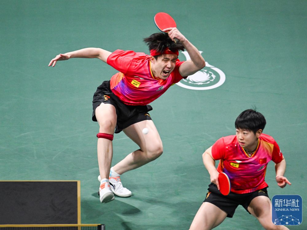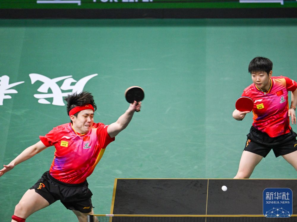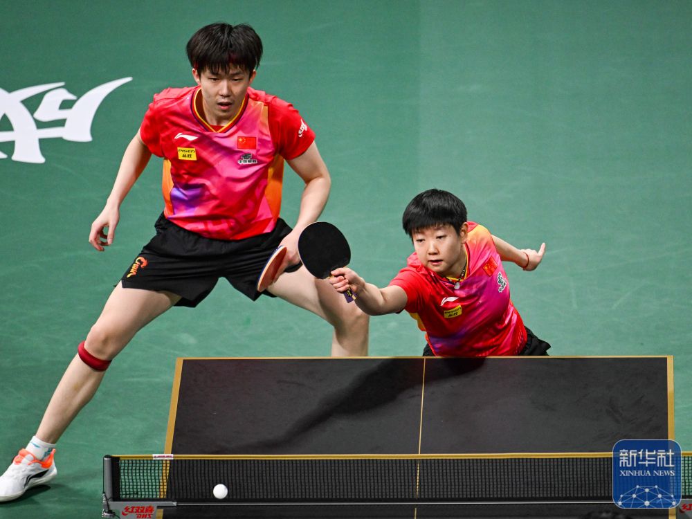 在混双比赛中,中国队组合王楚钦/孙颖莎2比1战胜韩国队组合赵大成/申裕斌。