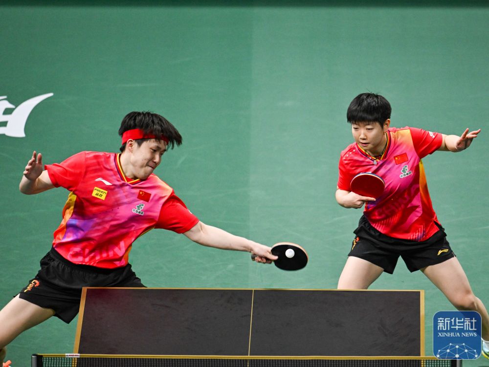 ↑中国队组合王楚钦/孙颖莎(右)在混双比赛中。新华社记者 王曦 摄