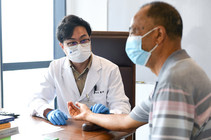 来自香港的注册中医师郭钧泯(左)在深圳市中医药传承发展研究院为病人看诊(2023年9月4日摄)。新华社记者 毛思倩 摄