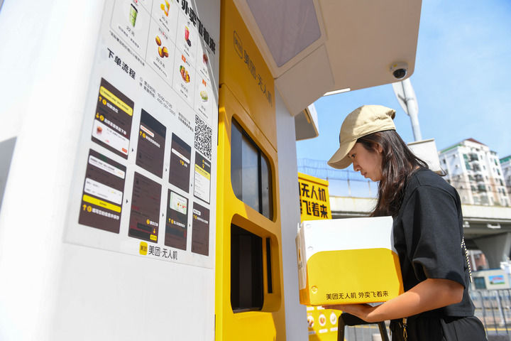 在深圳福田口岸,香港居民使用无人机外卖服务(2024年10月23日摄)。新华社记者 毛思倩 摄