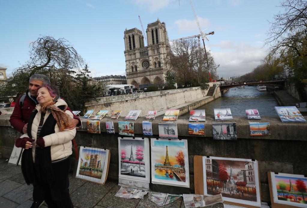 2023年12月8日,人们在修复中的巴黎圣母院前合影。新华社记者 高静 摄