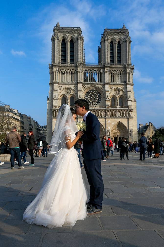 2019年3月23日,一对新人在巴黎圣母院前拍照。新华社记者 张铖 摄