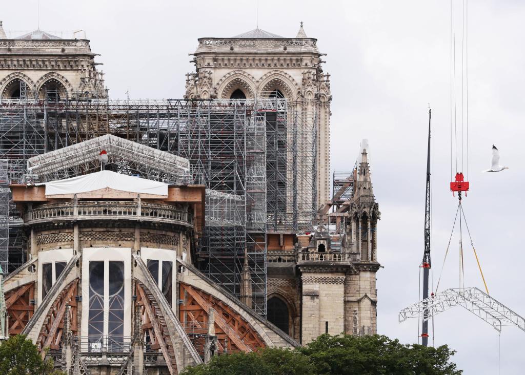 这是2020年6月9日拍摄的正在进行脚手架拆除工作的巴黎圣母院。新华社记者 高静 摄