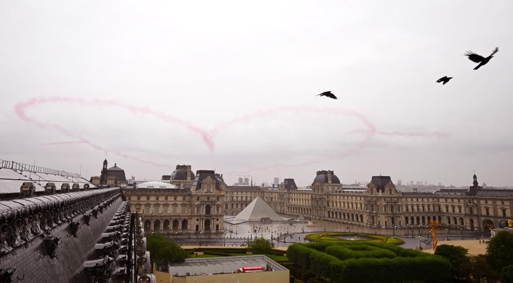 2024年7月26日在第33届夏季奥林匹克运动会开幕式上拍摄的巴黎圣母院上空的心形烟雾。新华社记者 夏一方 摄