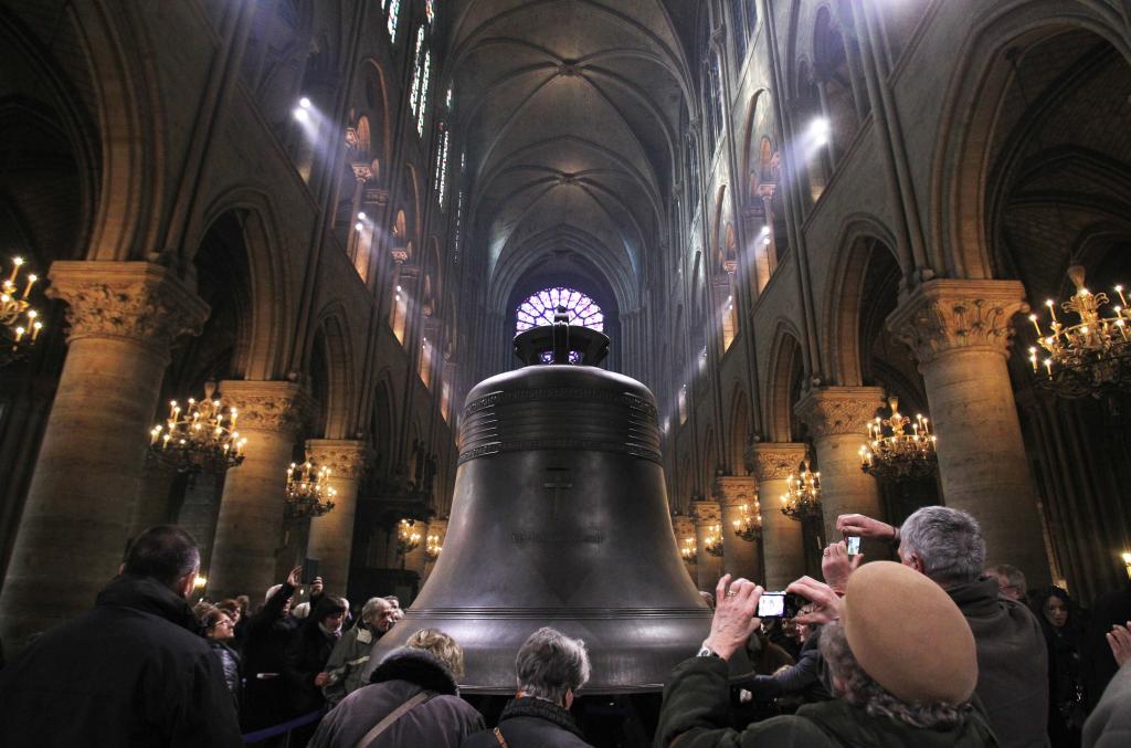 2013年2月15日,人们参观为迎接巴黎圣母院850岁生日建造的新铜钟。巴黎圣母院于2013年3月23日迎来850岁生日。新华社记者 高静 摄