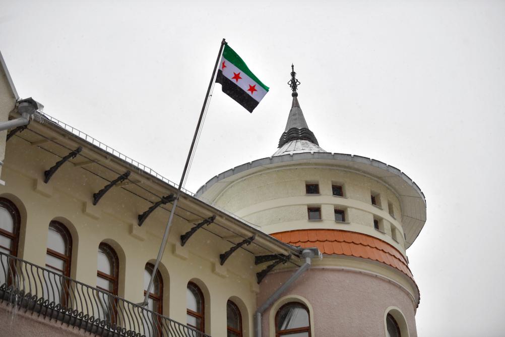 12月9日,在俄罗斯首都莫斯科,叙利亚驻俄罗斯使馆升起代表叙利亚反对派的旗帜。新华社发(亚历山大摄)
