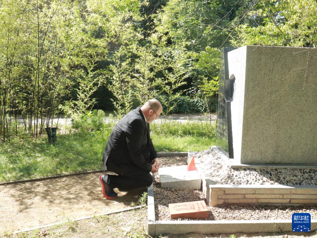 2024年7月6日,约翰·拉贝曾外孙赖因哈特在位于德国柏林的拉贝墓前悼念。新华社记者 李函林 摄