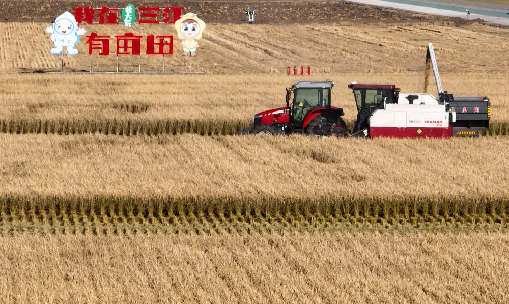 龙江大地,金风送爽,稻浪滚滚。建三江七星农场万亩大地号丰收在望,10台收割机一字排开,正在实施联合作业。