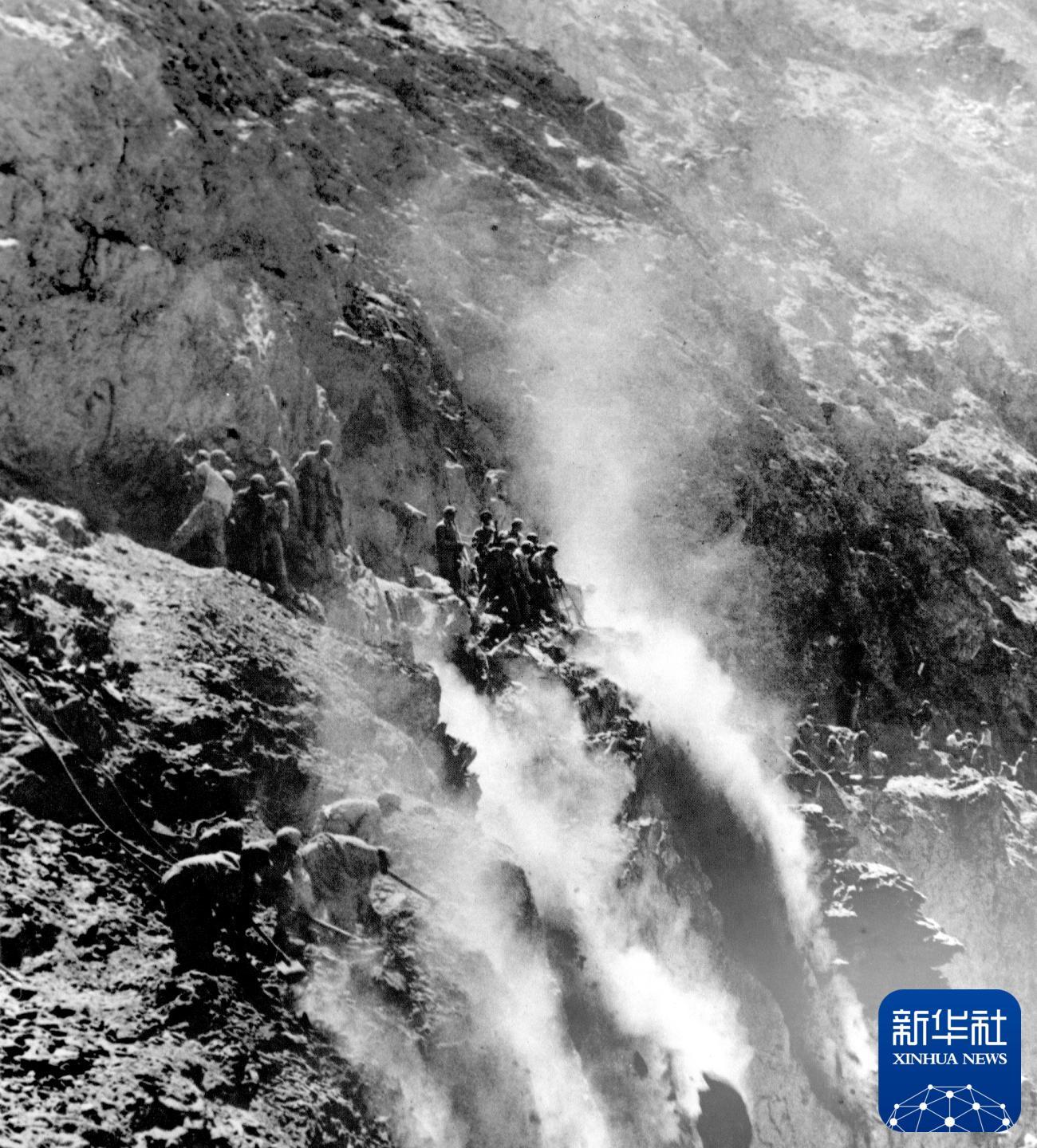筑路战士在怒江两岸的悬崖陡壁上辟山筑路。新华社发