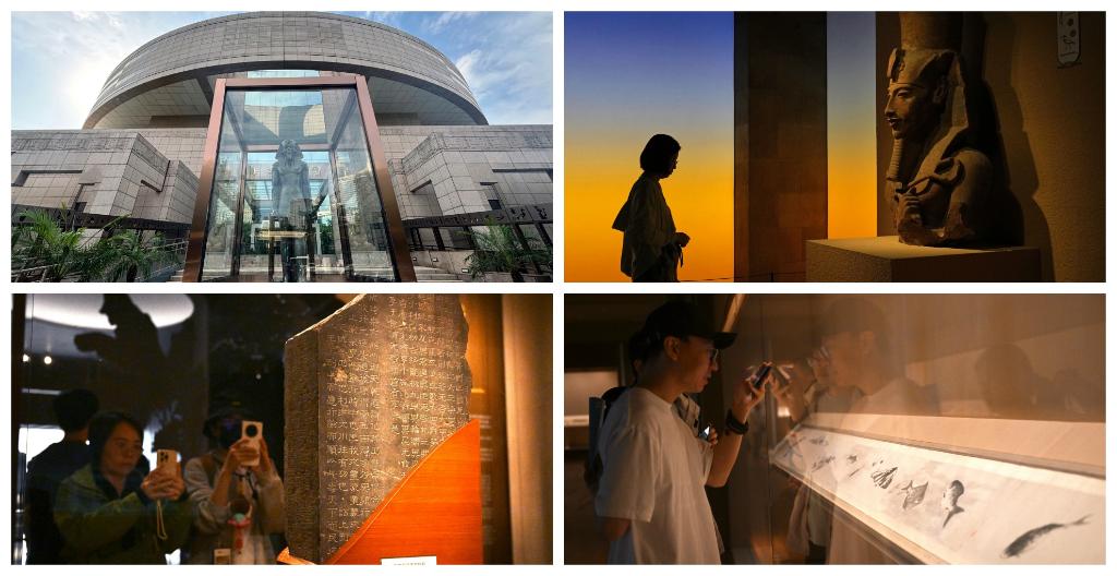 拼图:(左上、右上)上海博物馆人民广场馆的“金字塔之巅:古埃及文明大展”;(左下)上海博物馆东馆的中国历代书法馆(右下)上海博物馆东馆的中国历代绘画馆