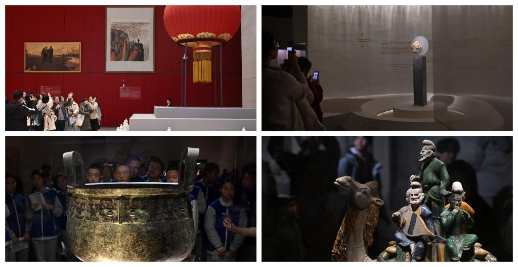 拼图:走进中国国家博物馆感受“文博热”:(左上)“风展红旗如画——馆藏红色经典文物展”(右上)“美的多元——古希腊的艺术与生活”展览(左下、右下)“古代中国”基本陈列展