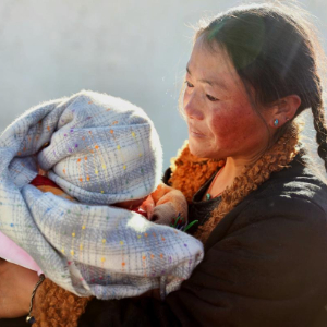 1月8日,定日县长所乡通来村的受灾群众措姆抱着自己的孩子在领取志愿者送来的御寒衣物。