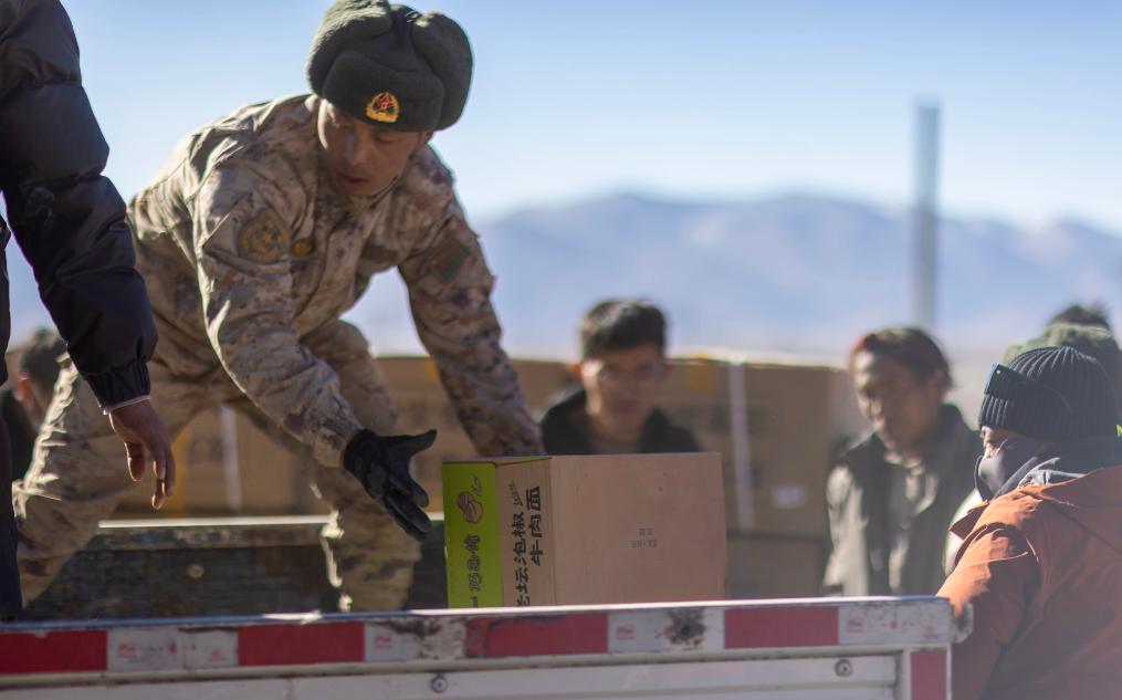 1月8日,解放军战士在尼辖乡雪龙村帮助受灾群众搬运生活物资。