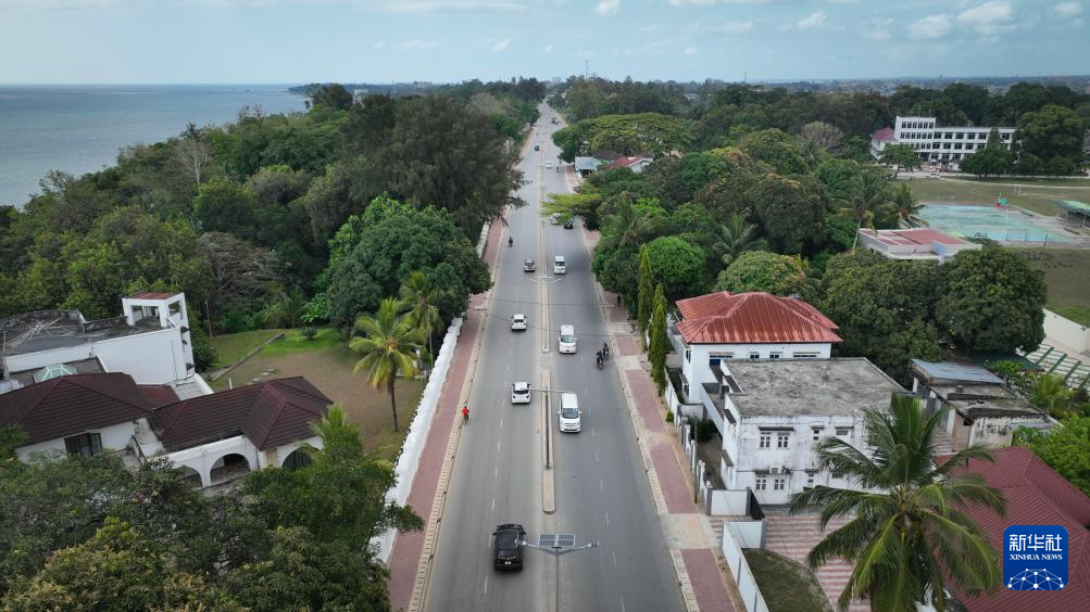 这是在坦桑尼亚桑给巴尔岛拍摄的主城区100公里市政交通道路升级改造项目中已完工并通行的一段道路(无人机照片,2024年10月23日摄)。新华社发(中土集团供图)