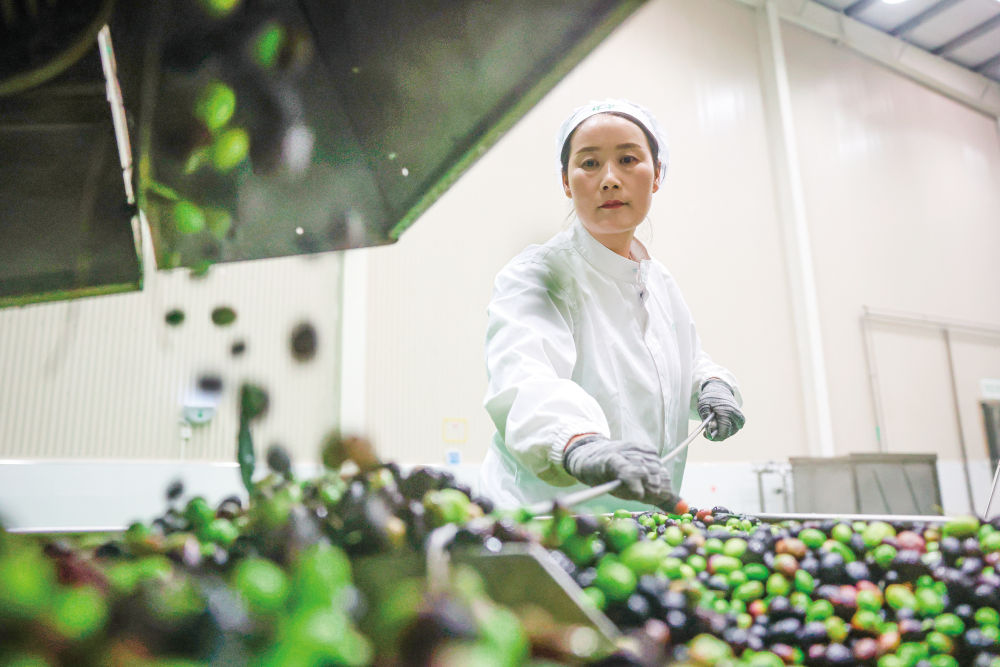 10月31日,在甘肃省陇南市武都区一家油橄榄加工企业,工作人员在生产线上作业。 新华社记者 陈斌 摄
