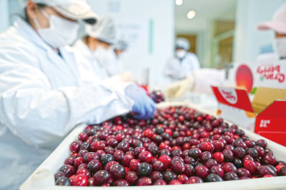 在黑龙江省抚远市蔓越莓种植基地研发中心,工作人员正在挑选蔓越莓鲜果。新华社记者王建威