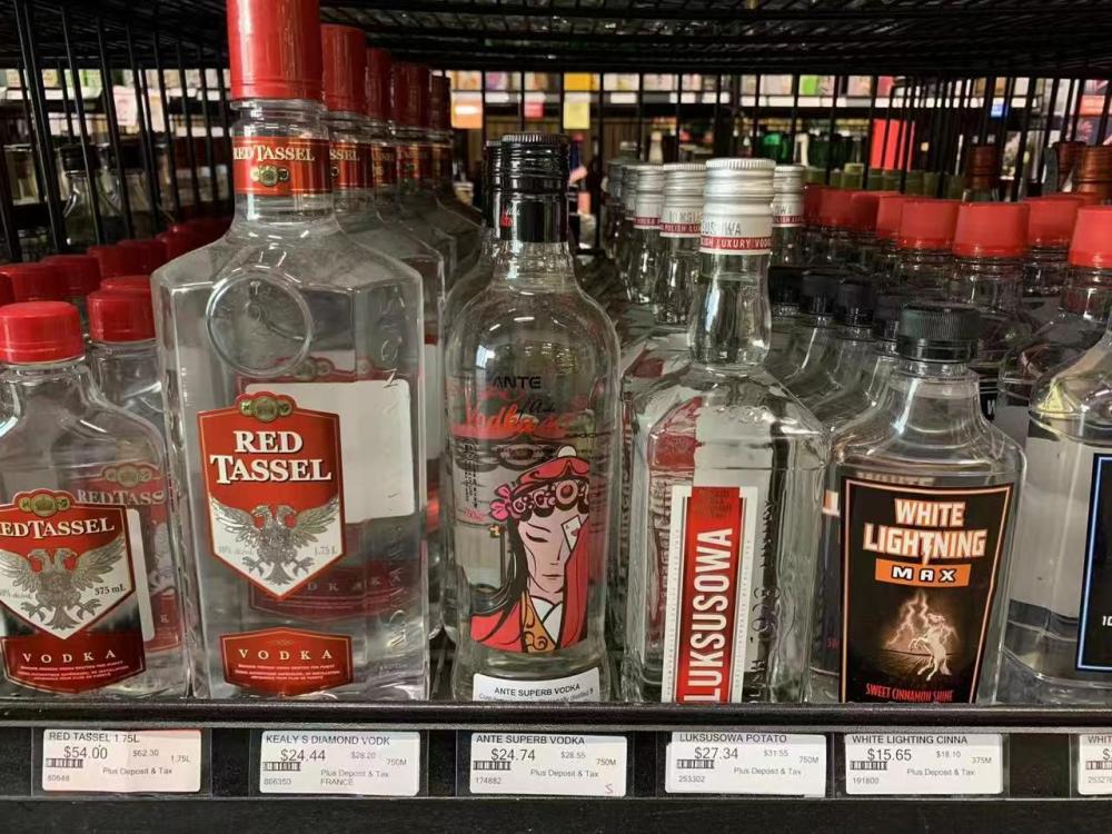 加拿大超市货架上的中国产国粹脸谱系列伏特加。受访者供图