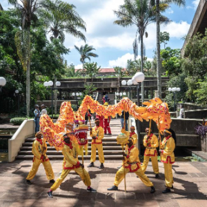 2024年1月31日,内罗毕大学孔子学院学生在位于肯尼亚首都内罗毕的联合国环境规划署总部表演舞龙。