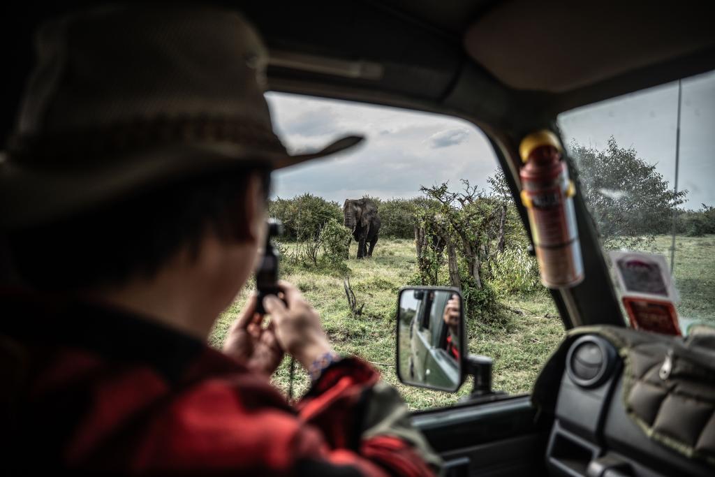 2024年8月22日,在肯尼亚马赛马拉奥肯耶保护区内,卓强在观察大象。