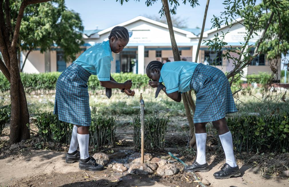 2024年6月18日,在肯尼亚图尔卡纳郡卡库马难民营内,毕生希望女子中学的学生在课间休息时洗脸。