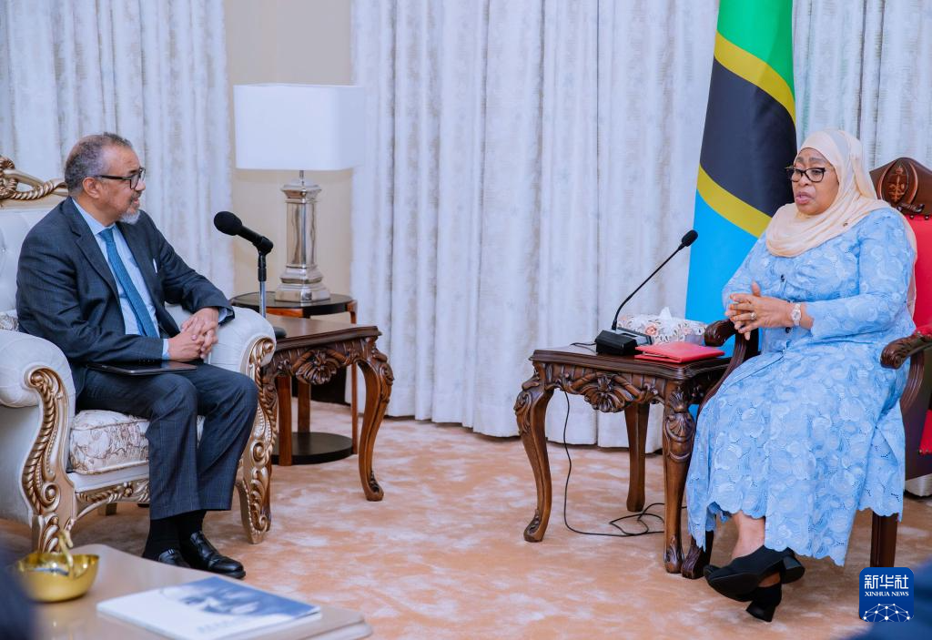 1月20日,坦桑尼亚总统萨米娅·苏卢胡·哈桑(右)在首都多多马与世界卫生组织总干事谭德塞举行会谈。新华社发(坦桑尼亚总统府供图)