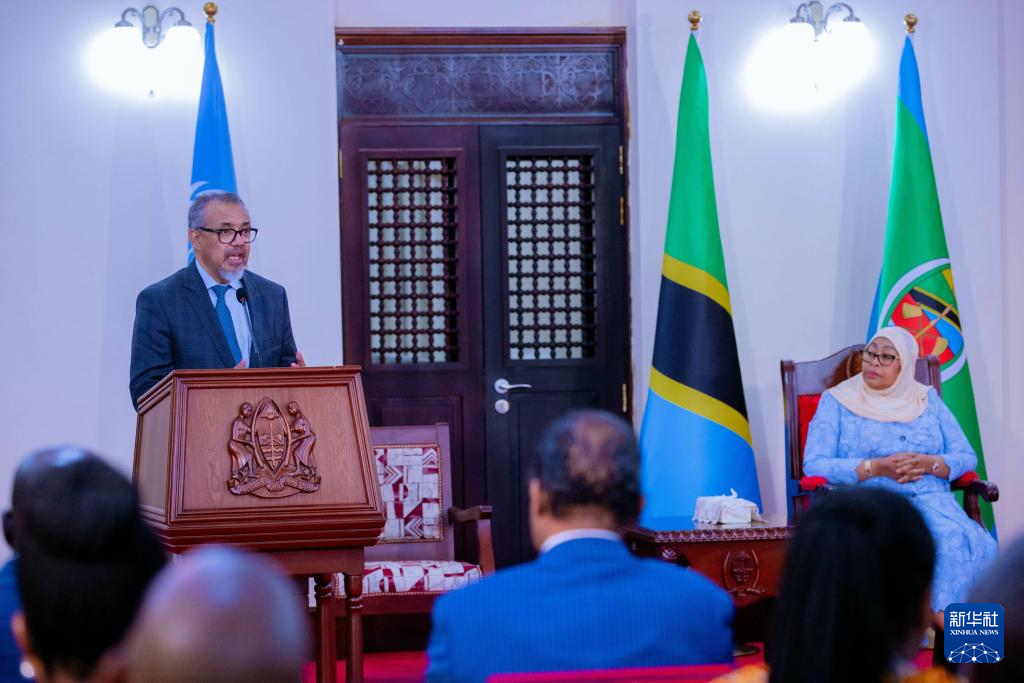 1月20日,坦桑尼亚总统萨米娅·苏卢胡·哈桑(右)在首都多多马与世界卫生组织总干事谭德塞共同出席新闻发布会。新华社发(坦桑尼亚总统府供图)