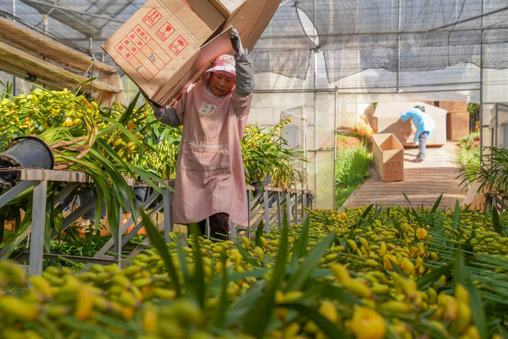 2024年11月25日,在云南昆明金才农业科技有限公司种植基地,工作人员在打包运输即将发货的大花蕙兰。新华社发(彭奕凯 摄)