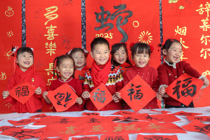 1月13日,在山东省高密市金苹果幼儿园新春游园活动现场,孩子们在晒福字。春节临近,大街小巷张灯结彩,人们逛集市、购年货,参加各种迎新年活动。新华社发(李海涛 摄)