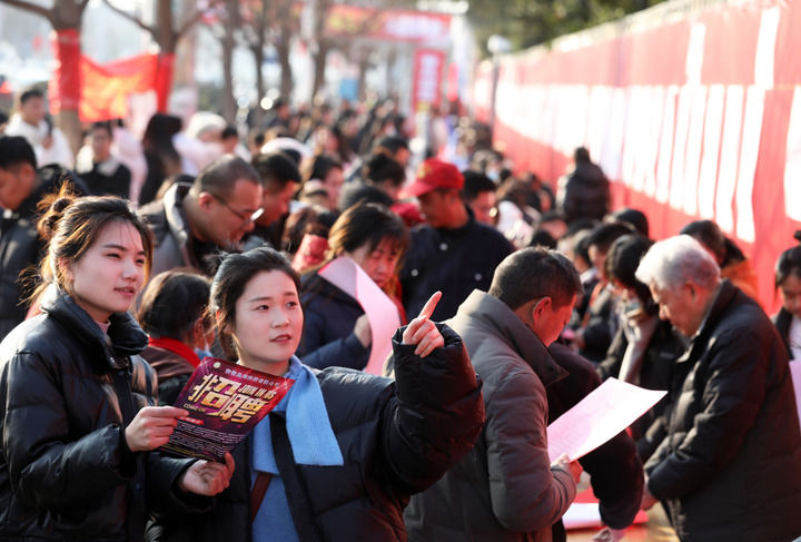 2025年1月22日,在安徽省淮北市濉溪县2025年“春风行动”大型招聘会现场,求职者在了解招聘信息。新华社发(李鑫 摄)