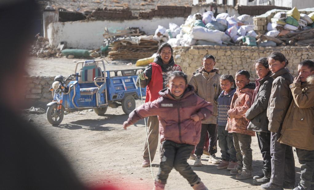 1月25日,在定日县曲洛乡热木青村安置点,大学生志愿者在安置点和孩子们一起玩游戏。新华社发