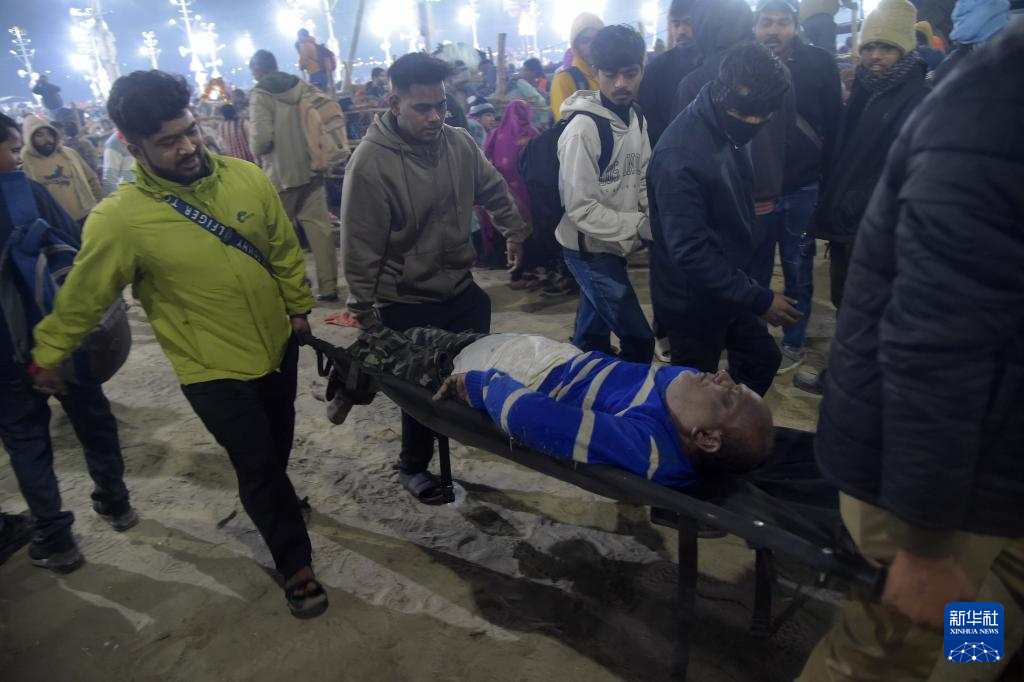 1月29日,在印度北方邦普拉亚格拉杰市,人们搬运踩踏事件中的伤员。新华社发