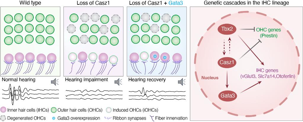 “我们通过在单细胞水平分析内毛细胞和外毛细胞的显著差异表达基因,发现了Casz1。它是一个锌指转录因子,也是一个古老的决定细胞功能和命运的基因,但其在耳蜗毛细胞中的功能还一无所知。”刘志勇说。