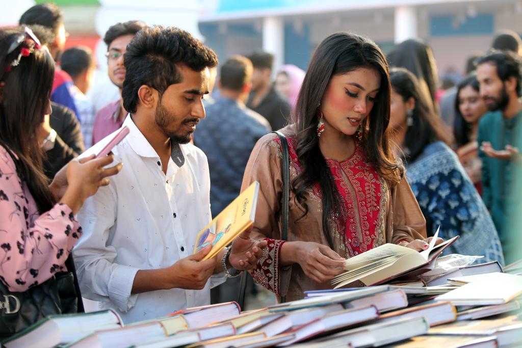 2月7日,在孟加拉国首都达卡举行的“二月书展”上,人们阅览书籍。新华社发(哈比卜·拉赫曼摄)