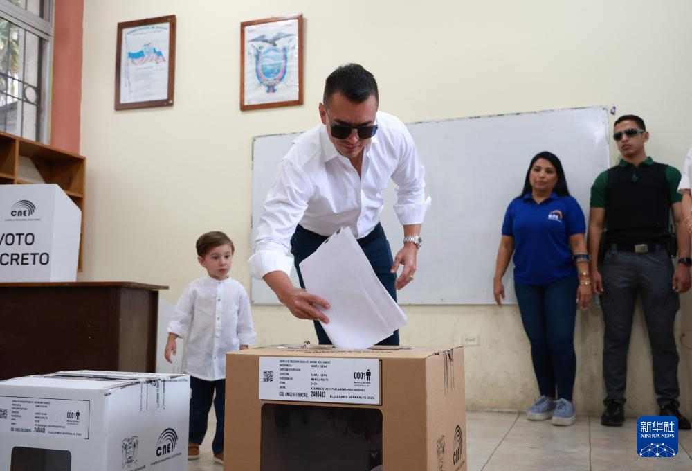 2月9日,在厄瓜多尔奥隆,厄现任总统诺沃亚参加投票。新华社发(厄瓜多尔总统府供图)