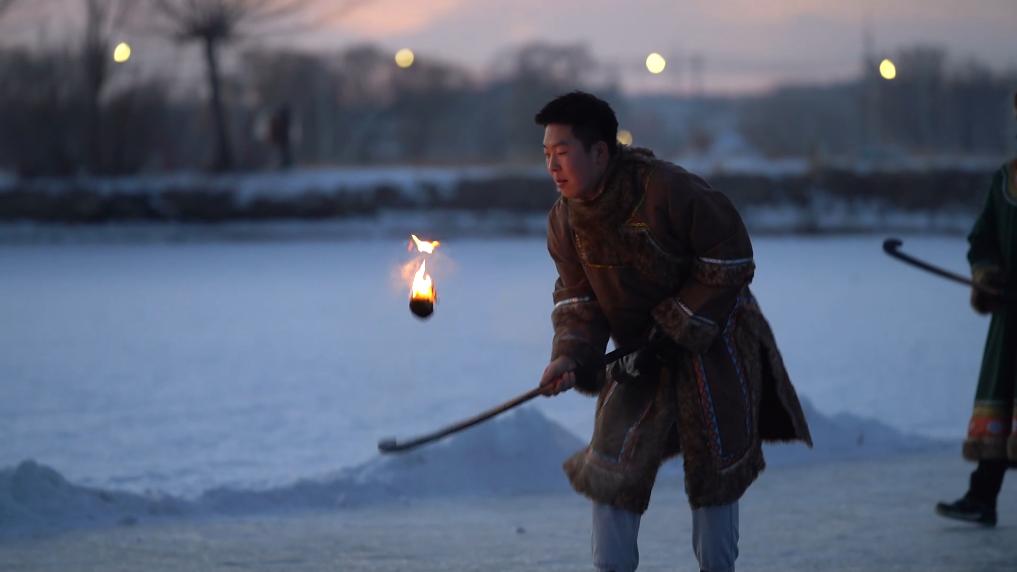 随着参与者将火球点燃,挥杆将火球挑起、抛掷,炽热的火球在冰面上飞驰,在空中起舞,划出一道道火光,宛如一条火龙奔腾穿梭。一场充满力量与激情的达斡尔族火球赛精彩上演。