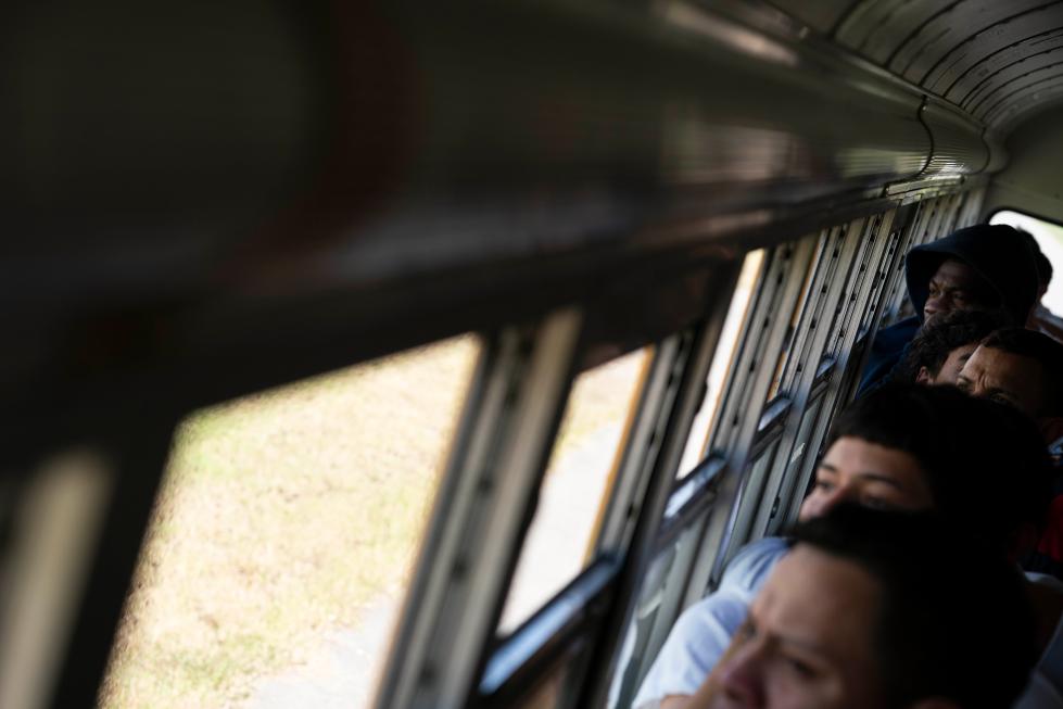 2月14日,在洪都拉斯西北部城市圣佩德罗苏拉,返乡移民乘坐返乡移民援助中心的巴士前往车站。新华社发(戴维 摄)